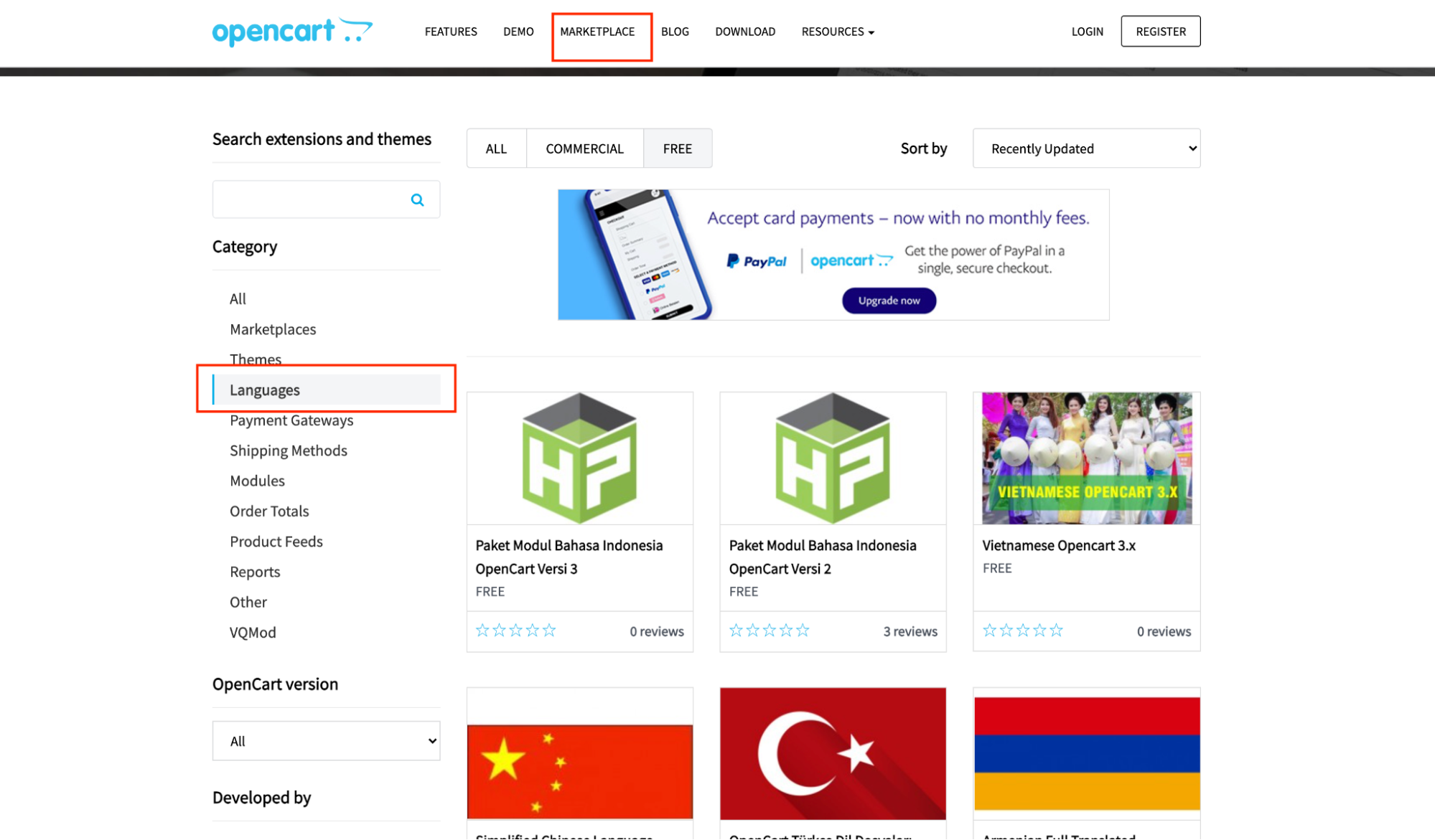 To download a language pack from OpenCart Marketplace, follow these steps:
