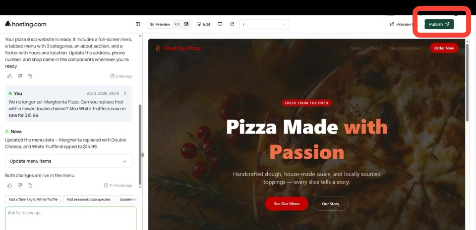 Running a business means things change — and updating your site should never be a headache. Need to swap out a menu item or update a price? Just tell the AI what you need.