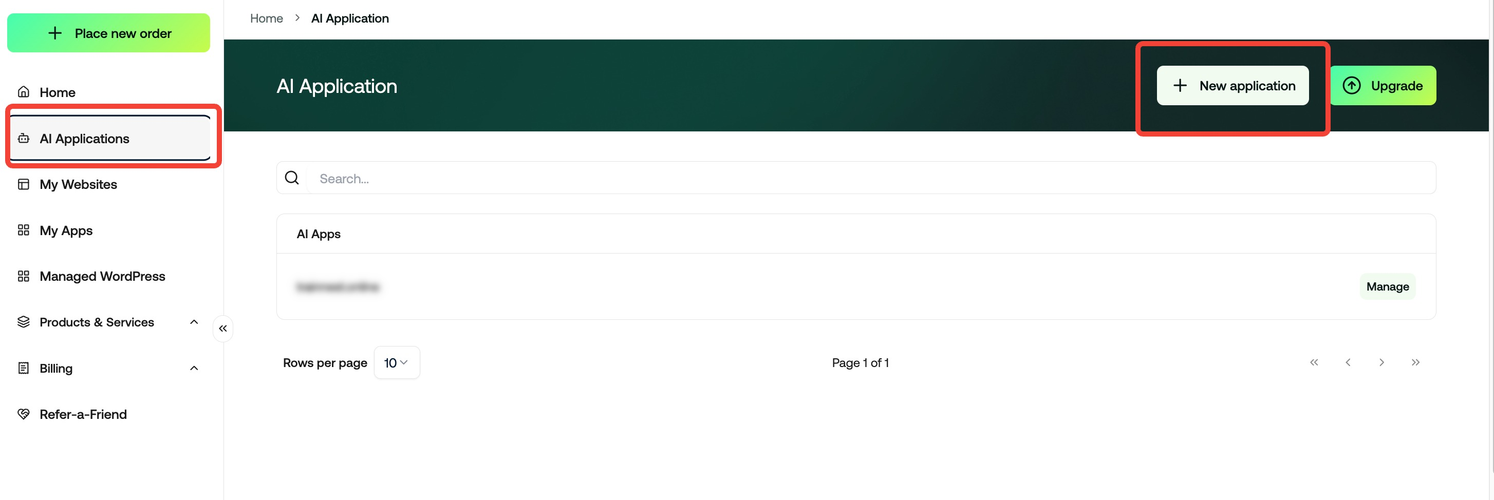Log in to your client area. In the left-hand navigation panel, click AI Applications, then click the "+ New Application" button in the top-right corner of the page.