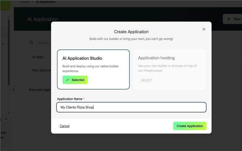 Once inside the AI Application Studio, simply describe what you want built. It's that straightforward. In our example, we typed: