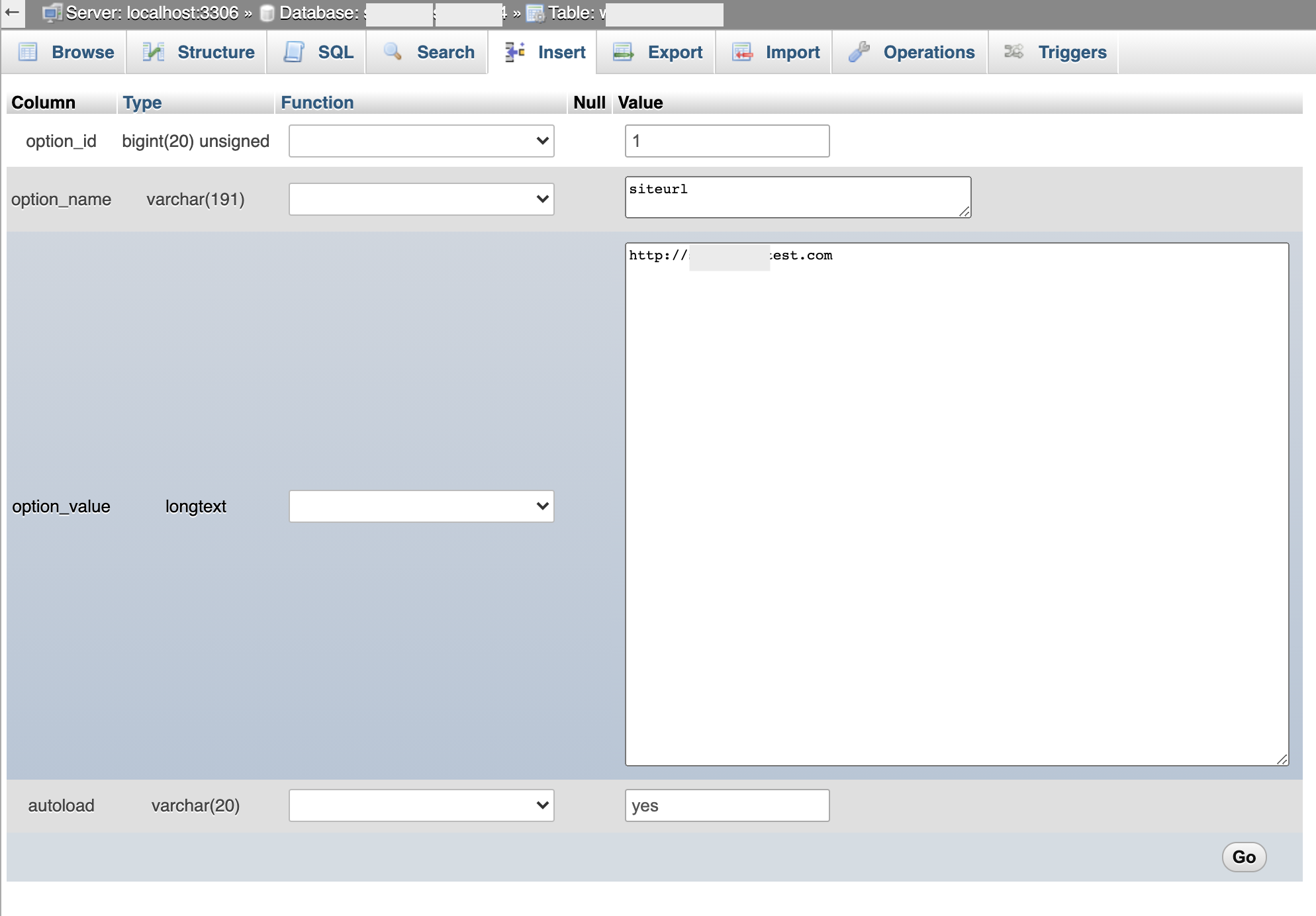 - Click Go. phpMyAdmin saves the changes in the table. WordPress should now function correctly using the new URL.
