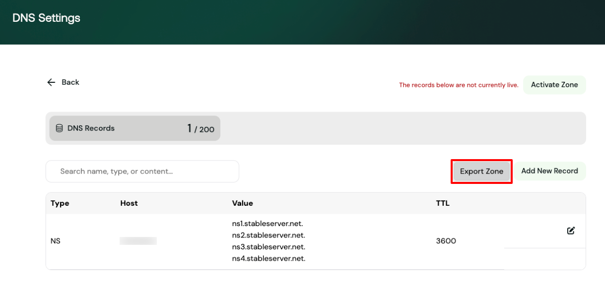 The exported zone file reflects the Client Area DNS zone only. If your domain is using a hosting product (for example, cPanel) or external nameservers, those DNS records will not be included in the export.