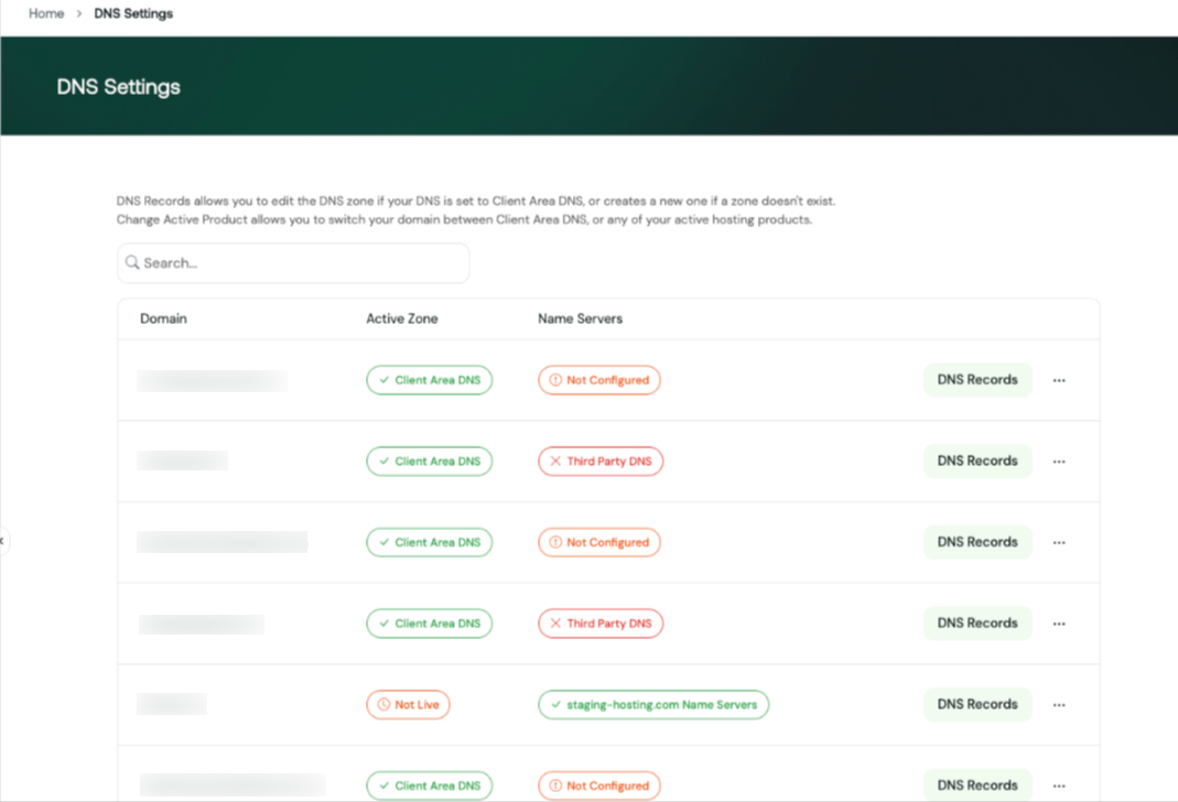 The DNS Manager in the Hosting.com Client Area has been updated to provide more control over DNS configuration. With these updates, you can now create and manage your own Client Area DNS zone directly from the DNS Editor. This allows you to control where your DNS zone is managed and easily switch the DNS master between the Client Area and your active hosting products. The update also introduces a new domain listing page that shows DNS zone status and nameserver configuration for each domain, making it easier to see where DNS is managed.