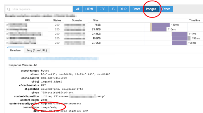 Furthermore, Cloudflare delivers images in the WebP format if the WebP version is significantly smaller than lossless or lossy compression, and if the browser has the following in its Accept header: