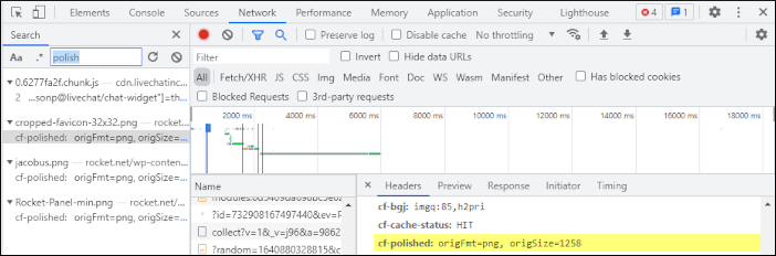 You can verify that Polish is working by viewing the HTTP headers for images loaded on your site. In the Chrome developer console, click the Network tab, and then load your site. Search for the word “polish” and then click one of the results: