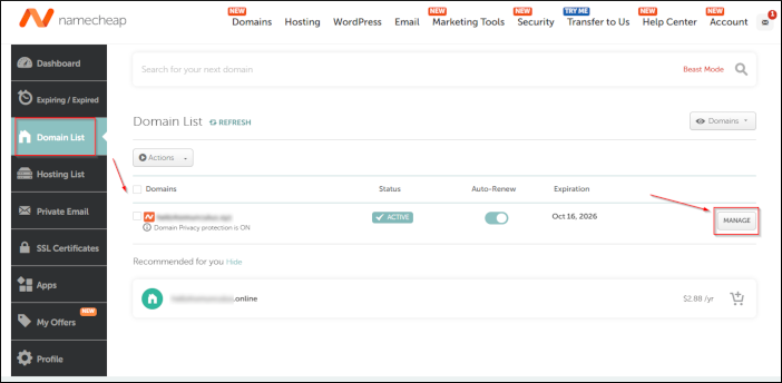 In the left sidebar, click Domain List, locate your domain, and then click Manage: