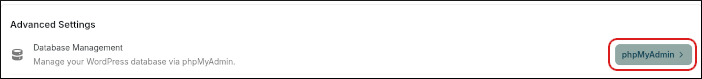 In the Advanced Settings section, in the Database Management row, click phpMyAdmin: