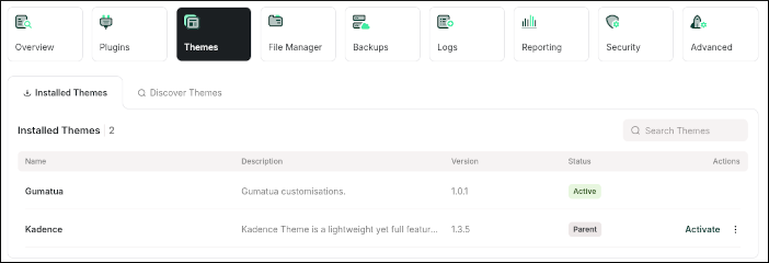 On the Themes tab is a list of all of your installed WordPress themes, both activated and inactive. You can view the current version number, as well as if there are any updates available. Also, you can install and activate a theme without logging in to the WordPress admin dashboard.