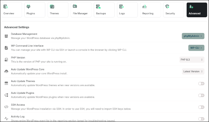 - Enable or disable automatic updates for WordPress core, themes, and plugins.