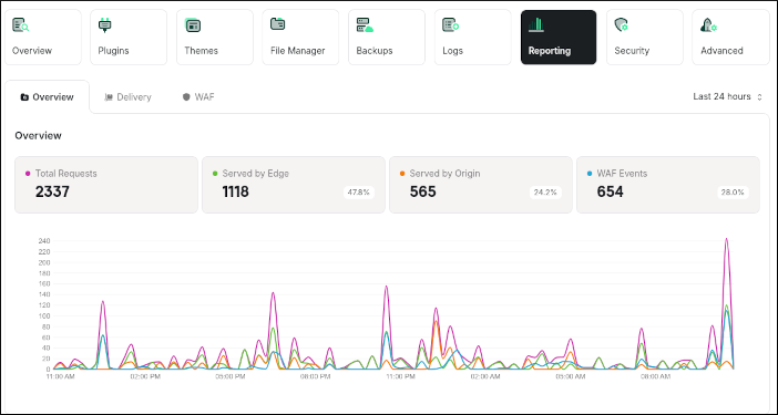 On the Reporting tab, you can view detailed reporting for the WAF (Web Application Firewall) and CDN (Content Delivery Network).
