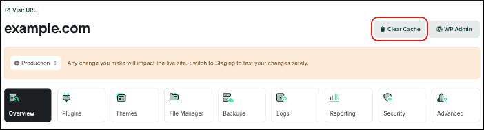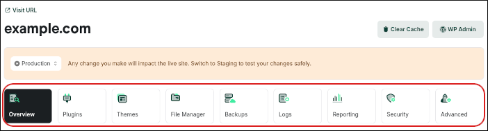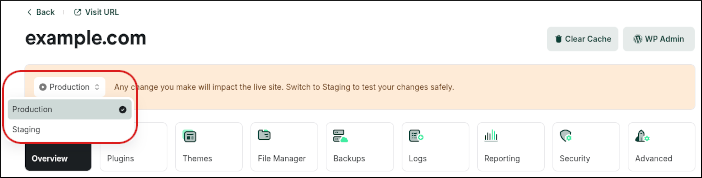 There are Production and Staging status indicators to remind you which site you are currently managing. You can easily change between the production and staging environments using the following list box: