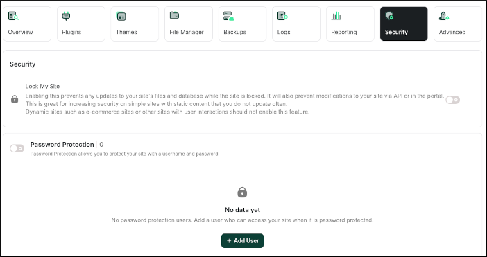 On the Security tab, you can lock your site to prevent any updates to your site's files and database. For example, if you have a site with static content, this feature helps increase site security. On the other hand, if you have a site dynamic content (such as an e-commerce site), you should not enable this feature.
