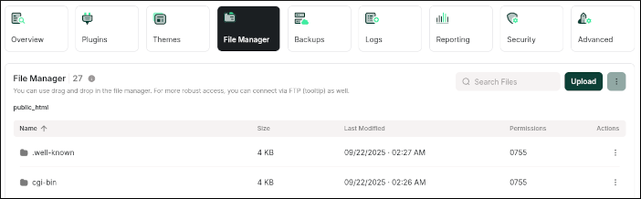 On the File Manager tab, you can view, edit, upload, download, and delete your website files.