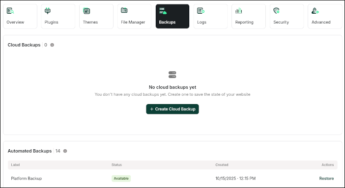 - Cloud Backups: You can create as many cloud backups as you want, depending on your disk space. These are recommended when you’re rolling out a change on your live site that perhaps you couldn’t test on staging.