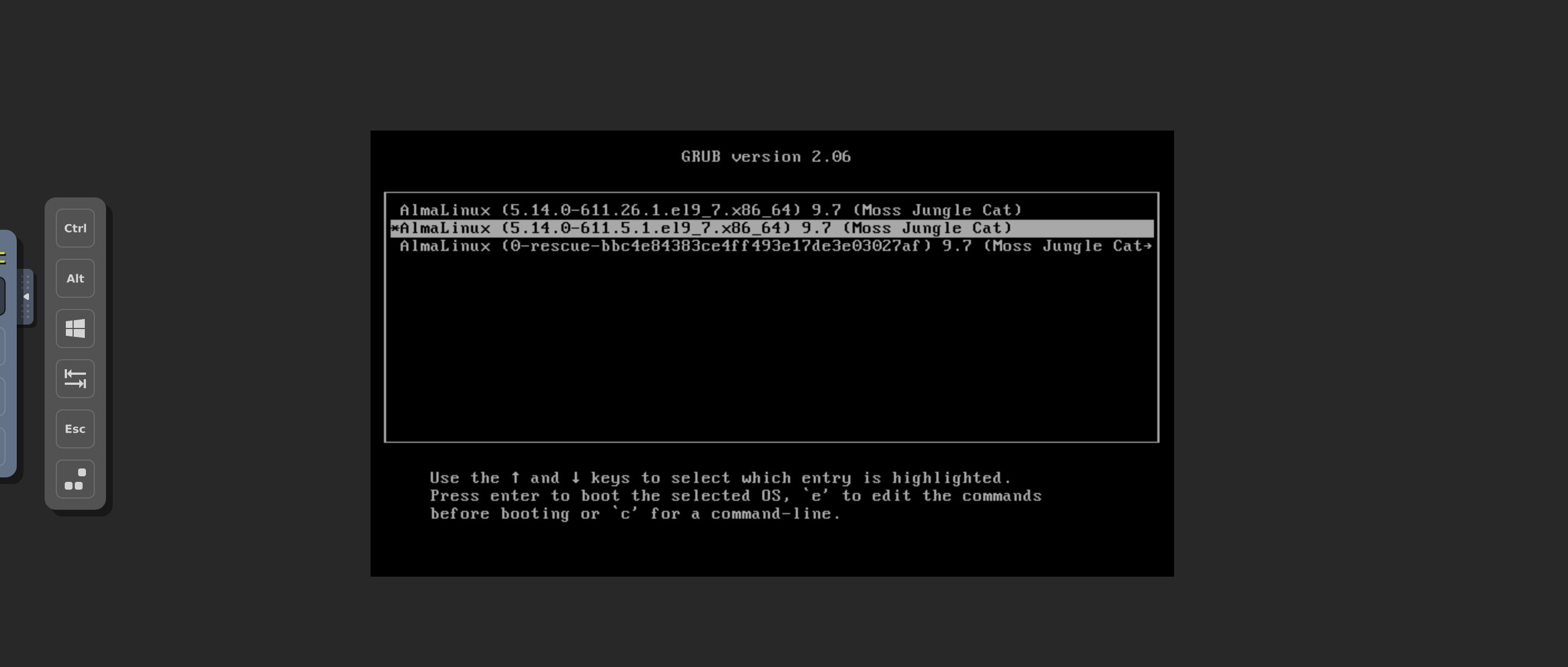 - When the GRUB menu appears, select the default kernel entry. You should navigate with the arrows