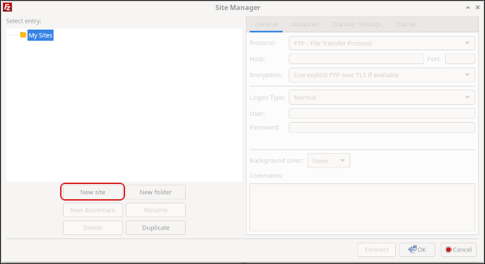 On the File menu, click Site Manager. The Site Manager dialog appears.