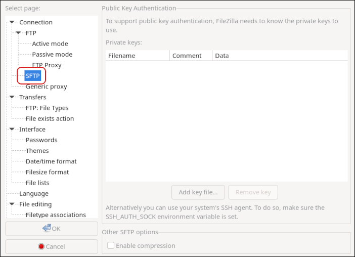 Now that your public key is configured in the hosting.com Dashboard, it’s time to connect using an SFTP client. The following procedure demonstrates how to configure FileZilla: