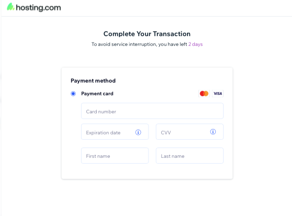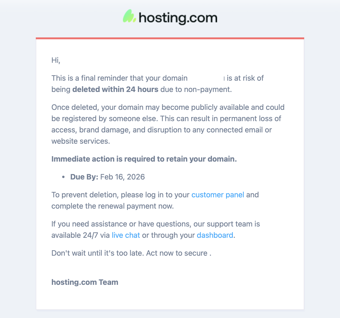 Please be aware of a scam email claiming that your services need to be renewed and encourages you to click on links that go to a payment-page. Do not process a payment on this page. Please check the due-date and auto-renew status of your hosting.com services by logging into my.hosting.com