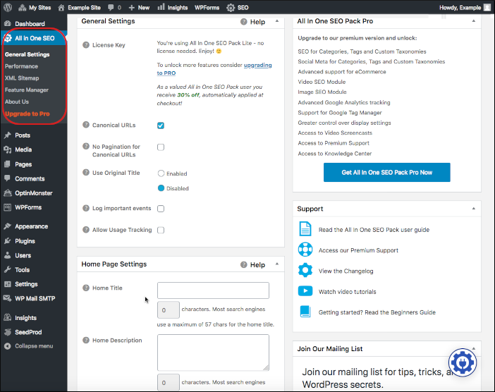 With this plugin enabled, at the top of your WordPress dashboard, in the left sidebar, is the All in One SEO option. Go to General Settings from its menu to get started configuring things:
