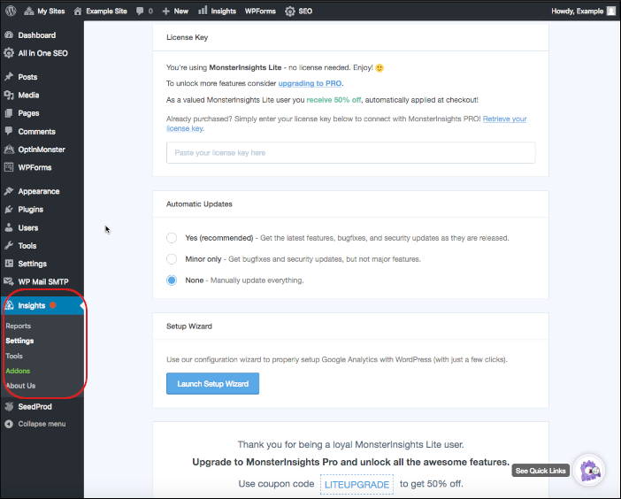 With this plugin enabled, you’ll see an Insights option near the bottom of the left sidebar on the WordPress dashboard. Hovering over this option opens a menu with a link to the Settings page to get started: