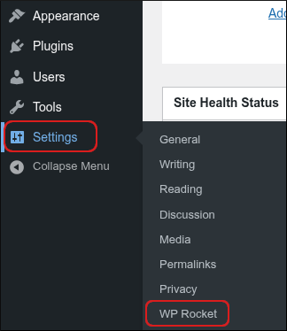 On the WordPress dashboard, in the left sidebar, click Settings, and then click WP Rocket: