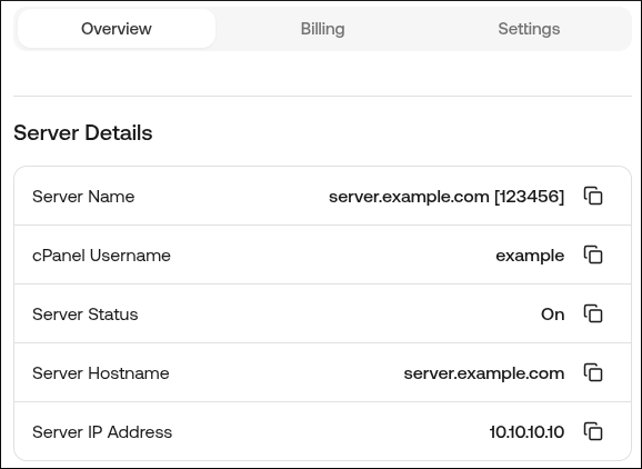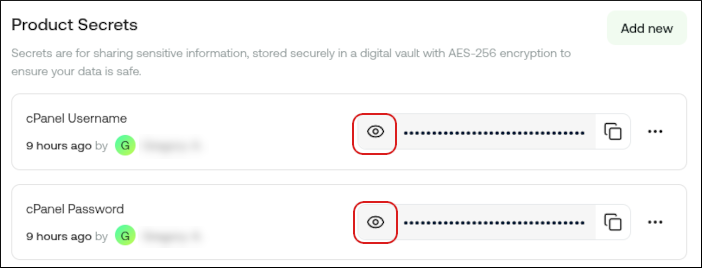 cPanel/WebHost Manager username and password. To view your cPanel/WHM login credentials, scroll down to the Product Secrets section, and then click the eye icon: